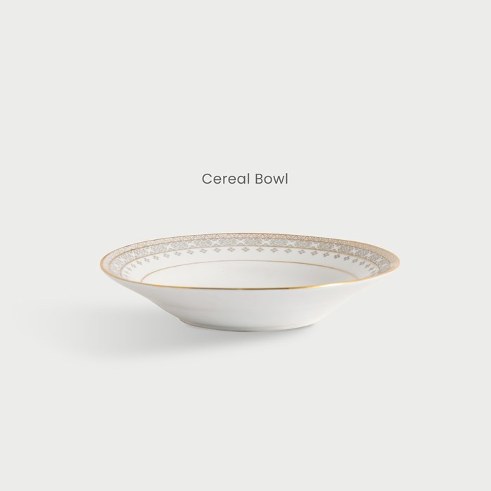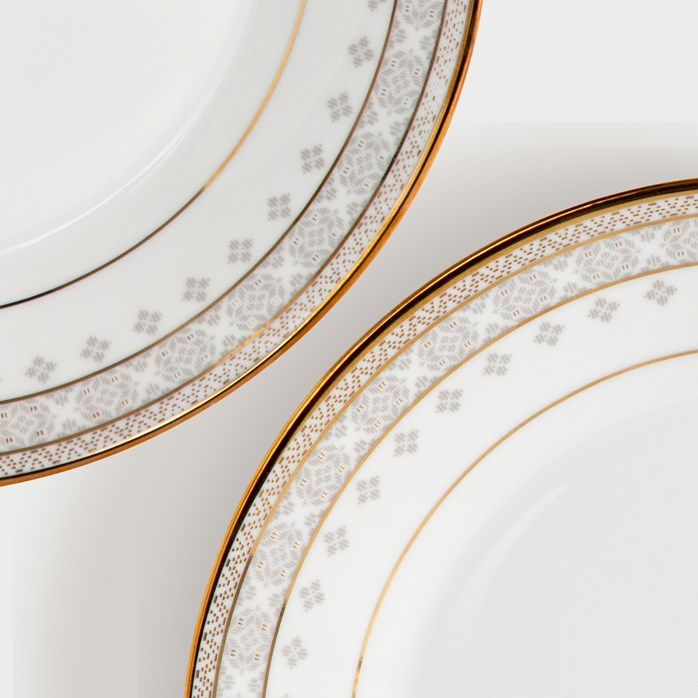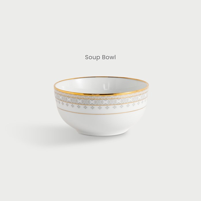 Bibir setiap pinggan dan mangkuk dihiasi corak geometri halus menyerupai tenunan songket mewah, melambangkan warisan, kemewahan dan kehalusan seni Melayu.