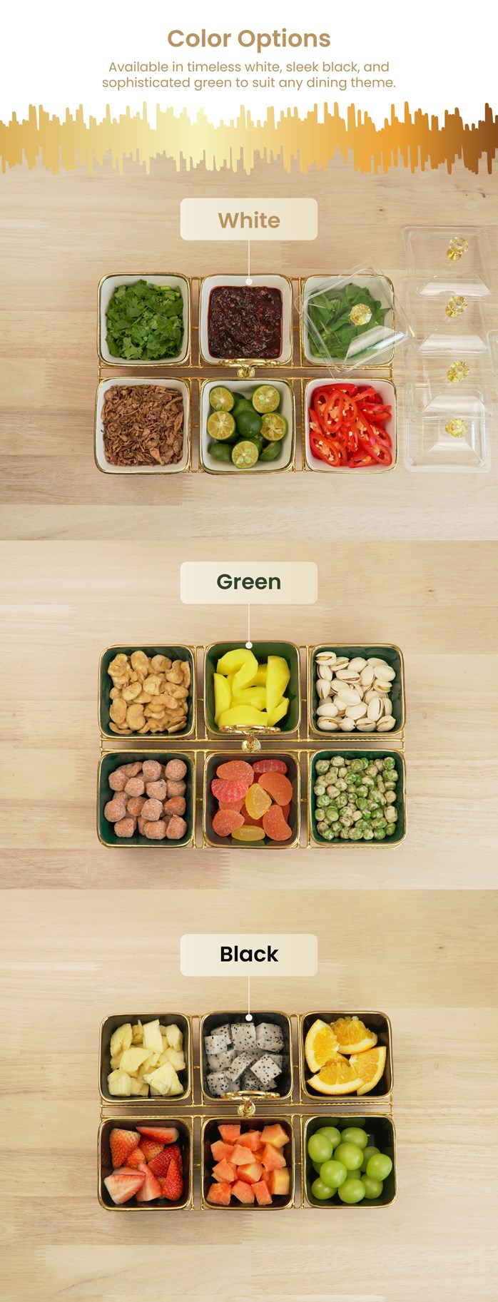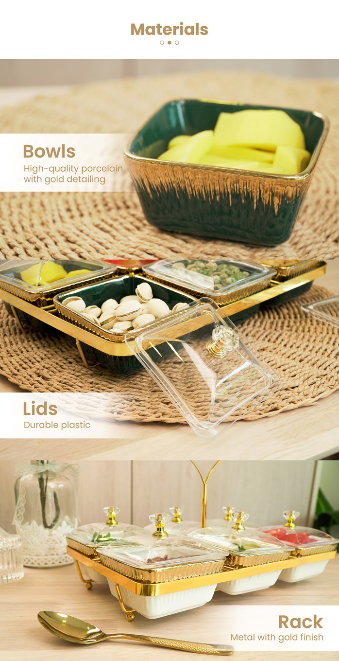 Mangkuk porselin dipadankan dengan rak emas mewah untuk persembahan yang sofistikated.