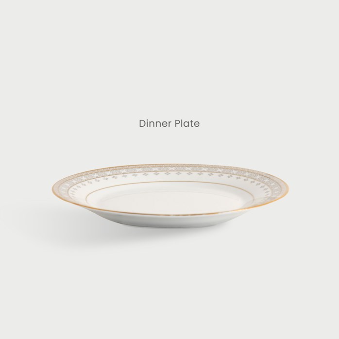 Permukaan luas dengan rim emas motif songket — sesuai untuk nasi, lauk pauk, atau hidangan Barat.