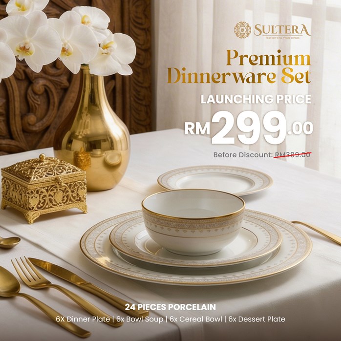Memperkenalkan Set Pinggan Mangkuk Premium Sultera, Edisi Songket — koleksi porselin eksklusif yang diperkaya dengan motif beraksen emas halus, diinspirasikan daripada keanggunan tenunan songket tradisional Melayu. Setiap helaian menampilkan gabungan harmoni antara warisan budaya dan sofistikasi kontemporari, membawa prestij, nostalgia dan keindahan yang anggun ke setiap hidangan.